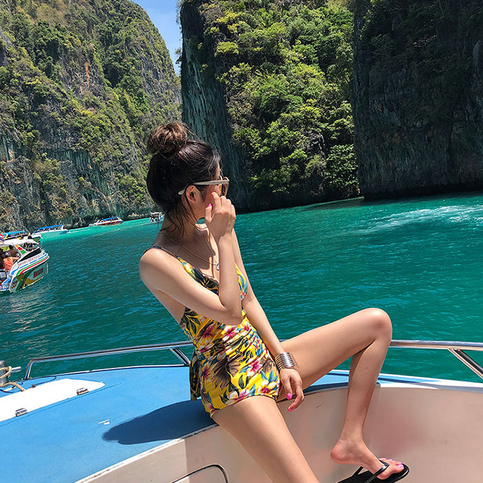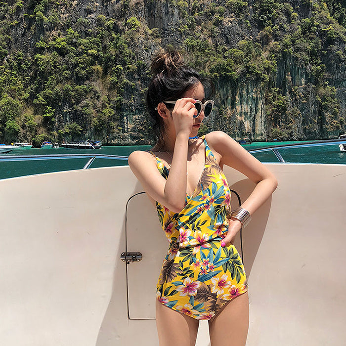 Sultry deep V-neck printed lace-up bikinis